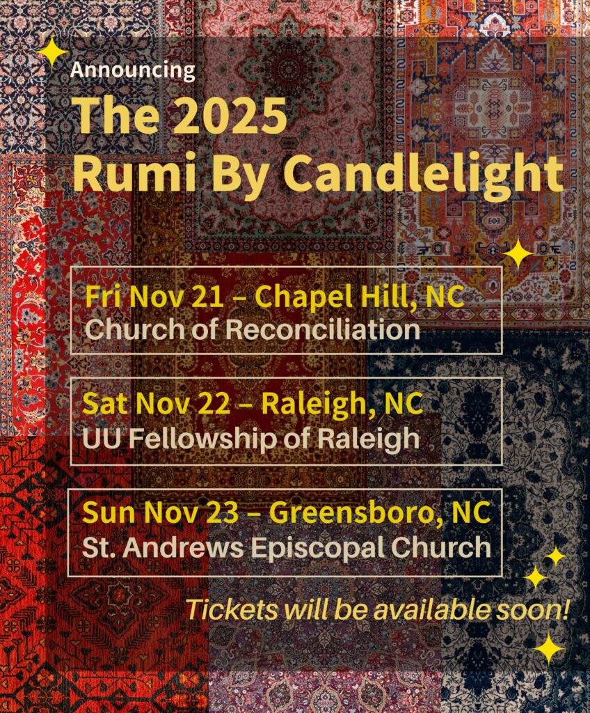 A few hundred years later, Rumi’s rhapsodies found their echoes resonating with a small group of creatives, instrumentalists, and poets. Invigorated by his poetry, Rumi by Candlelight came together in early 2007 to set original music to recitations of Rumi’s poetry. Using the West African kora, the bansuri flute of the Indian subcontinent, the European piano, and both English and Persian words, these creatives manifested Rumi’s message of unity and harmony in a whole new dimension.